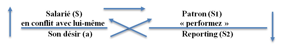 Derrière ces chiffres, l’entreprise produit un savoir objectivé (S2) : graphiques, comparaisons, KPI, feedbacks. Chaque geste est chiffré, évalué, mis en tableau. Le salarié demeure partagé, jamais totalement en accord avec lui-même face aux injonctions. Il reste en conflit avec lui même, car son engagement singulier n’apparaît jamais dans ces comptes. Ce qui est produit, enfin, c’est de la jouissance (a) : hyper-disponibilité, angoisse, sentiment d’être réduit à une ressource quantifiable.